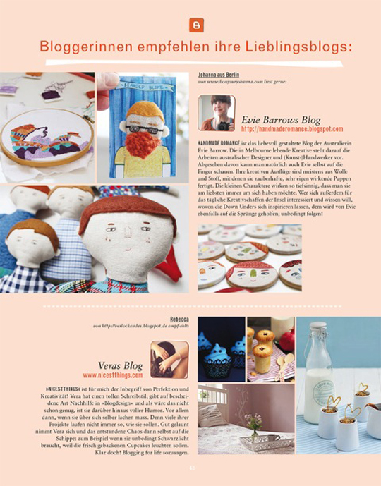 Late last year I was contacted by the lovely people at HANDMADE Kultur a German magazine focused on DIY and Handmade. Unbeknown to me a little feature on my blog had been created by the sneaky Johanna from Bonjour Johanna and was going to be included in their first issue of this year. Just last week I heard back and received an image of the page I'm on, here it is.
